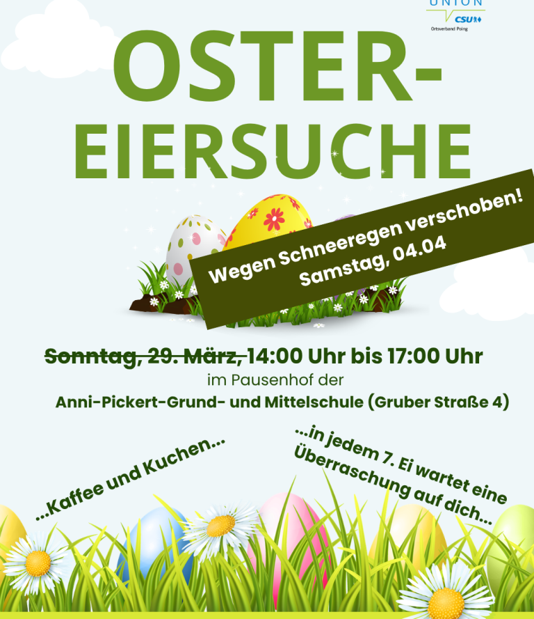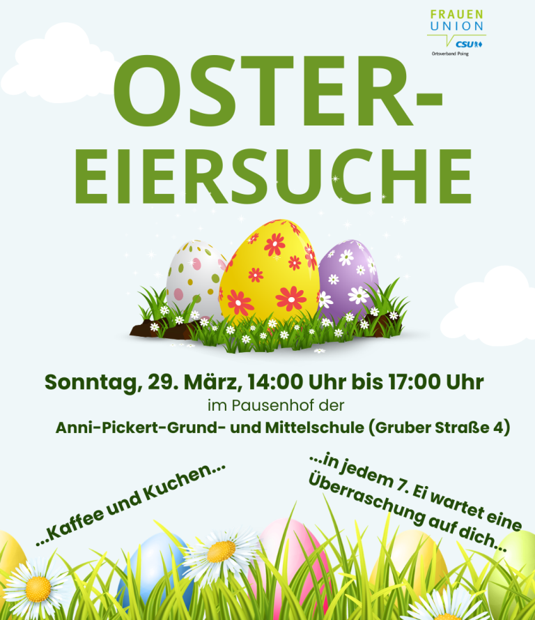 Nach der Wahl möchten wir wieder gemeinsam mit Ihnen schöne Momente in unserer Gemeinde erleben. Deshalb laden wir Sie und Ihre Familien ganz herzlich zu unserer Ostereiersuche der Frauen-Union Poing ein.