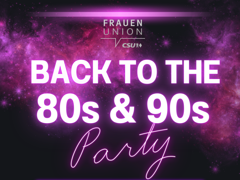 Freut euch auf einen Abend voller Musik, Nostalgie und guter Stimmung bei der Back to the 80s & 90s Party der Frauen-Union. Kommt vorbei, tanzt mit uns durch die größten Hits dieser Jahrzehnte und erlebt eine besondere Zeitreise in geselliger Atmosphäre. Wir freuen uns auf euch!